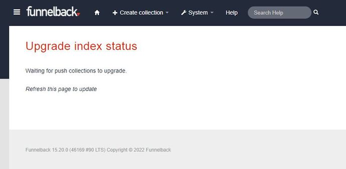I’m having some trouble with the upgrade from 15.18 to 15.20. The install has worked fine but when asked to index status after the first sign in to the admin interface its freezing on ‘Waiting for push collections to update’. I’ve left this for sometime now but still no further forward. Is there anything i should be aware of which would be causing this?